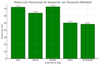 Figura 19: Reducción Porcentual de Radiación: Reducción de radiación en cada cara con los Parasoles Metaball.