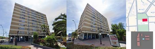 Figura 1b: Vista del edificio residencial situado en Plaza España, 6, Getafe (Madrid), acompañado por su ubicación en el entorno urbano y esquema volumétrico del emplazamiento.