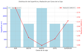 Figura 2: Relación entre Superficie y Radiación por Caras: Gráfico combinado que muestra la superficie (barras) y la radiación (línea), destacando la correlación entre ambas variables.