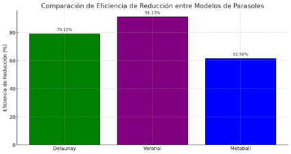 Este estudio comparó la efectividad de los tres modelos de parasoles (Delaunay, Voronoi y Metaball) frente a la radiación total del modelo base sin sombreado. Los resultados muestran que los parasoles Voronoi lograron la mayor reducción de radiación (91.13%), seguidos por Delaunay (79.15%) y Metaball (61.56%). Estos hallazgos destacan diferencias clave en la capacidad de sombreado y adaptabilidad de cada modelo.