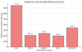 Figura 4: Radiación acumulada diaria para cada cara, mostrando cómo la orientación afecta la acumulación de radiación en kWh.