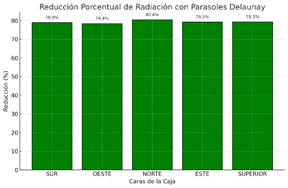 Figura 9: Reducción Porcentual de Radiación: Reducción de radiación en cada cara con los Parasoles Delaunay.