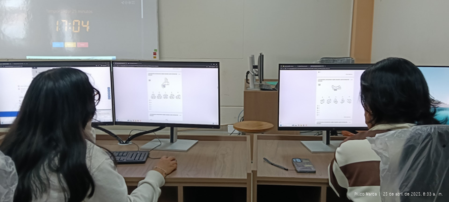 Figura 1: Estudiantes resolviendo digitalmente los subtests del Purdue Spatial Visualization Test (PSVT:V y PSVT:R) en Taller de diseño 1-2025