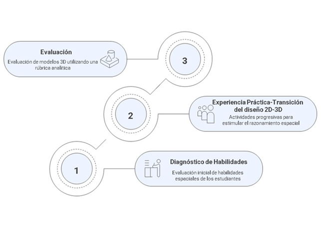 Figura 3: Etapas del estudio de Razonamiento espacial y su expresión en la metodología de transición del diseño 2D al 3D en estudiantes de Arquitectura