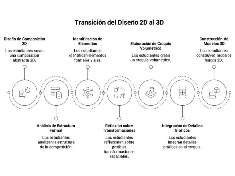 Figura 4: Secuencia de la experiencia práctica a través de la metodología de transición del diseño 2D al 3D.
