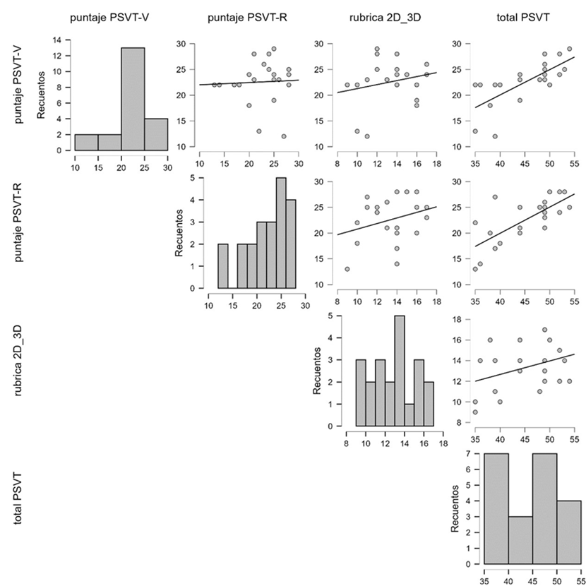 La prueba de normalidad de Shapiro-Wilk arrojó valores de p < .05 para PSVT:V (p = .027) y PSVT Total (p = .048), indicando distribución no normal para estas variables. Mientras que para PSVT:R (p = .119) y la rúbrica analítica 2D-3D (p = .452) mostraron distribución normal (p > .05). Se aplicaron pruebas paramétricas y no paramétricas según la naturaleza de cada variable. Se encontraron asociaciones positivas entre las dimensiones del PSVT total y la rúbrica analítica 2D-3D, según el análisis de correlación. Se obtuvo un coeficiente de correlación de r = 0.291 (p = .200) entre PSVT:R y la rúbrica analítica 2D-3D. Se obtuvo un coeficiente de correlación de ρ = 0.303 (p = .179) entre el PSVT Total y la rúbrica analítica 2D-3D. La correlación más débil se observó entre PSVT:V y la rúbrica analítica 2D-3D (ρ = 0.152; p = .500). La correlación entre PSVT:V y PSVT:R fue fuerte (ρ = 0.789; p < .001), indicando una consistencia interna alta en el instrumento PSVT. Se compararon los niveles de razonamiento espacial con el puntaje de la rúbrica analítica 2D-3D. El grupo con nivel alto en PSVT Total obtuvo un puntaje medio superior en la rúbrica (M = 13.91) en comparación con el grupo de nivel medio (M = 12.70). Aunque la prueba de Kruskal-Wallis no mostró diferencias estadísticamente significativas (H = 1.139; p = .286), el tamaño del efecto fue medio (ε² = 0.057), indicando una posible tendencia. Se categorizaron las variables PSVT Total y rúbrica analítica 2D-3D en niveles (bajo, medio, alto) en un análisis de contingencia. La prueba de Chi-cuadrado (χ² = 5.214; gl = 2; p = .074) indicó una asociación cercana al umbral de tendencia, pero no alcanzó significación estadística. Un tamaño de efecto medio fue de 0.387 para el coeficiente V de Cramer. Los estudiantes con nivel alto en PSVT total obtuvieron un desempeño medio o alto en la rúbrica analítica 2D-3D. Por otro lado, los estudiantes con nivel medio en razonamiento espacial mostraron mayor dispersión. En conjunto, los resultados entregan una visión clara del perfil espacial de los estudiantes y su relación con el desempeño en diseño tridimensional. Los patrones observados respaldan la utilidad del PSVT como herramienta diagnóstica en contextos educativos y justifican estrategias pedagógicas diferenciadas desde etapas iniciales de formación en arquitectura, aunque no se demuestra asociaciones estadísticamente concluyentes. La Figura 5 muestra una tendencia positiva entre las puntuaciones del PSVT-V, PSVT-R, la rúbrica analítica 2D-3D y el total PSVT. Los histogramas reflejan concentraciones altas en los puntajes de visualización y rotación espacial, y una distribución más dispersa en el desempeño 2D-3D. Las correlaciones gráficas evidencian coherencia entre las pruebas cognitivas y la ejecución proyectual tridimensional.
