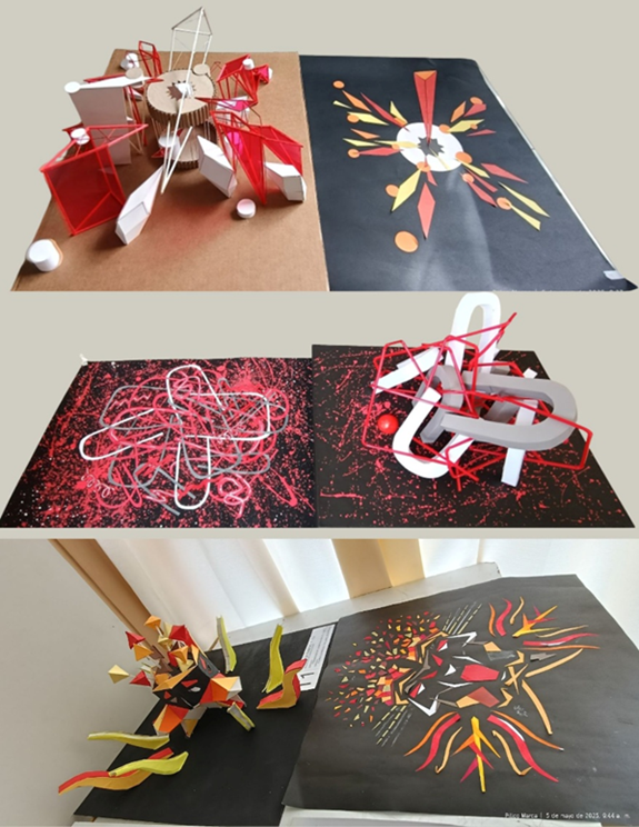 Figura 6: Modelos tridimensionales de estudiantes con alto nivel de razonamiento espacial, mostrando la transformación de composiciones bidimensionales en estructuras espaciales complejas y dinámicas.