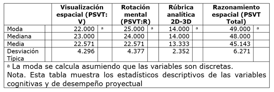 Tabla 1: Estadísticos descriptivos: visualización espacial (PSVT:V), Rotación mental (PSVT:R) Razonamiento espacial total (PSVT total) y Rúbrica analítica 2D-3D.