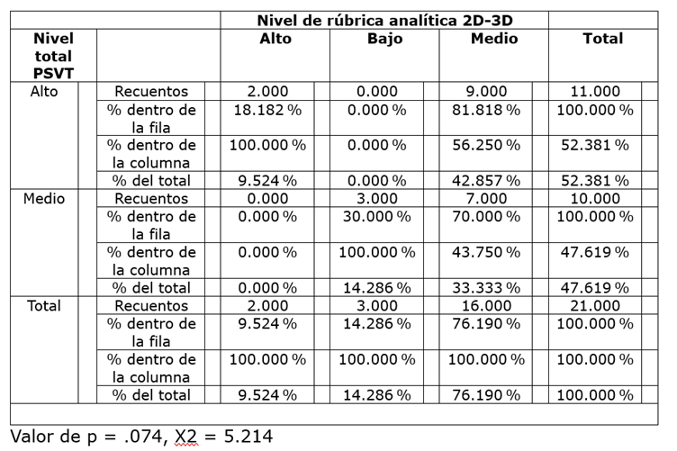 Tabla 2: Relación entre el nivel total del PSVT y el nivel de desempeño proyectual (rúbrica analítica 2D-3D).