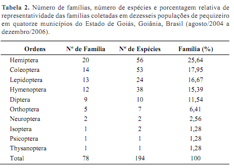 Foram obtidas 194 espécimes de insetos utilizando o pequizeiro como sitio de abrigo e/ou como alimento. A porcentagem relativa de ocorrência das famílias por ordem foi: Hemiptera (25,64 %), Coleoptera (17,95 %), Lepidoptera (16,67 %), Hymenoptera (15,39 %), Diptera (11,54 %), Orthoptera (6,41 %), Neuroptera (2,56 %), Isoptera (1,28 %), Thysanoptera (1,28 %), Psicoptera (1,28 %) (Tabela 2).