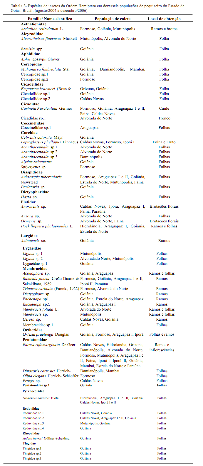 Ordem Hemiptera: Foram identificadas 56 espécies de insetos em plantas de pequizeiro em 20 famílias (Tabelas 2 e 3). As espécies mais freqüentes foram Edessa rufomarginata, Aethalion reticulatum, Ramedia juncta e Enchenopa sp.2.