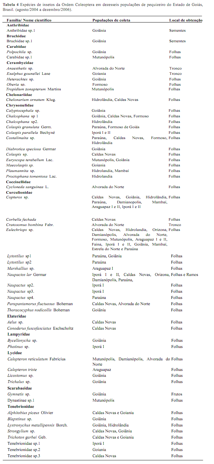 Ordem Coleoptera: Foram obtidas 53 espécies de coleópteros de 14 famílias (Tabelas 2 e 4). A espécie Naupactus lar foi a mais freqüênte nas populações de Iporá I, Ipora II e Caldas Novas. Na população de Iporá I a presença deste inseto foi expressiva no mês de novembro, ocorrendo em 80 % das plantas. Estes insetos foram encontrados no Cerrado goiano geralmente copulando e alimentando-se das folhas do pequizeiro causando redução da área foliar, prejudicando com isto a fotossíntese da planta. O reflexo da redução da área foliar, causada pelos insetos sobre a planta, pode ser influenciado pelo estagio da planta em que ocorre o ataque. As larvas dos insetos deste gênero alimentam-se das raízes das plantas causando danos consideráveis. Sugerindo a necessidade de estudos biológicos e comportamentais destes insetos nas raízes do pequizeiro, visando fornecer subsídios para manejo integrado nos sistemas agrícolas.