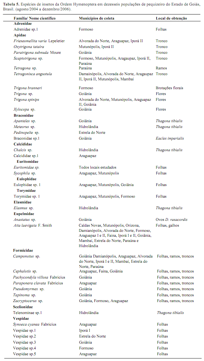 Ordem Hymenoptera: Os Hymenoptera representaram 15,39 % das famílias coletadas (Tabela 2 e 5). Dentre os himenópteros da família Formicidae a espécie Atta laevigata foi a única espécie identificada nas dezesseis populações levantadas nesse trabalho, com maior freqüência nas regiões Sul/Sudeste, Norte e Oeste do Estado de Goiás (Tabela 5).
