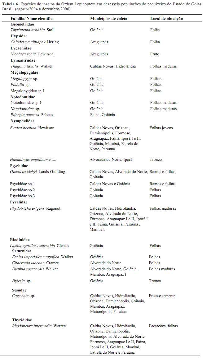 Ordem Lepidoptera: Os insetos da ordem Lepidoptera representaram 16,67 % das famílias coletadas (Tabela 2 e 7), totalizando 24 espécies associadas ao pequizeiro. Nessa ordem de insetos, as espécies Eunica bechina (Nynphalidae), Dirphia rosacordis (Saturniidae), Thagona tibialis (Lymantriidae), Rhodoneura intermedia (Thyrididae), Carmenta sp (Sesiidae), foram destacadas ou pela elevada população ocorrente, ou pela presença freqüente durante todo ano e, ou, pelo dano provocado nas plantas.