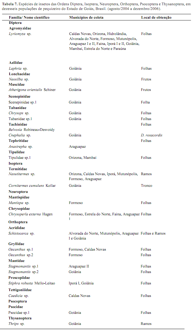 Os insetos das ordens Orthoptera, Isoptera, Neuroptera, Psicoptera e Thysanoptera, foram considerados insetos visitantes associados ao pequizeiro sem nenhuma constatação de relação com a planta hospedeiros.