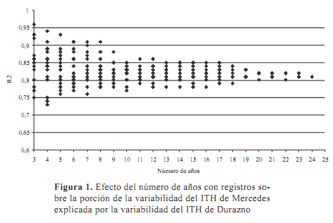 Los coeficientes de correlación obtenidos entre el ITH de las localidades estudiadas de a pares fueron significativos para todos los períodos analizados (25 a 3 años). El modelo de regresión lineal simple se ajustó en todos los casos para describir la asociación entre el ITH de las estaciones meteorológicas de cada una de las zonas en todos los tramos de 3 a 24 años (a <0,01). El máximo R2 obtenido en cada par de EM para los 24 años fue de 0,82. La asociación entre las EM a lo largo del tiempo, mostró valores de R2 por encima de 0,75 a partir de períodos de cinco o seis años de información, sin tomar en adelante valores inferiores. Lo anterior se verificó para el caso de Durazno y Mercedes (Figura 1) como para Paysandú y Salto (no mostrado). Esto significa que al utilizar 6 años de información de ITH para un sitio, se capturó el 75 % de la variabilidad contenida en el período de 24 años. Estos resultados coinciden con los encontrados por Hubbard (1994) y por Camargo y Hubbard (1999), quienes trabajaron con temperatura, humedad relativa, radiación solar, velocidad del viento y evapotranspiración potencial. Dichos autores reportan que la variabilidad de los elementos climáticos entre dos estaciones meteorológicas dentro de una zona subhúmeda y otra semiárida en las planicies de Estados Unidos, se estabilizó a partir de 6 ó 7 años de registros a lo largo de 14 años considerados. Es interesante destacar que aunque no hayan trabajado con ITH trabajaron con evapotranspiración potencial, variable climática de mayor complejidad que el ITH y que involucra en su cálculo, además de la temperatura y la humedad, la radiación y el viento.