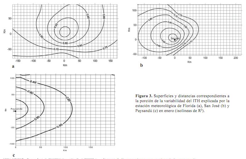 Los mapas elaborados para cada centro geográfico en el mes de enero, se presentan en la Figura 2 y los diagramas para cada CG se presentan en la Figura 3. Las áreas delimitadas por el trazado de líneas que unen puntos con el mismo valor de R2 (nivel de representatividad), muestran la superficie explicada por el ITH de cada CG (Figuras 2 y 3).