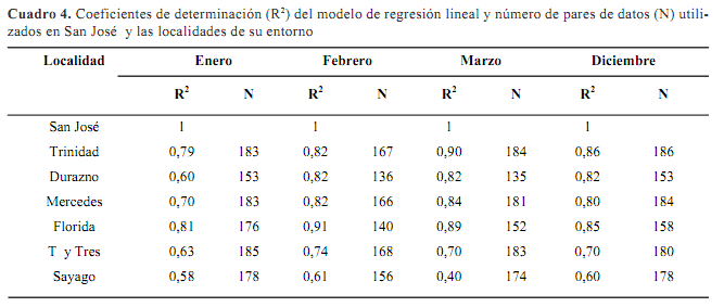 Los R2 representan la porción de la variabilidad del ITH que cada centro geográfico (Paysandú, San José o Florida) explica de la variabilidad del ITH de cada localidad vecina.