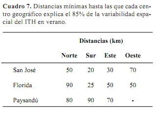 A los efectos de resumir los resultados, se asignó a cada punto cardinal de cada centro geográfico, la distancia mínima de representatividad espacial considerando los cuatro meses del verano en conjunto. La distancia mínima se obtuvo de los mapas, asumiendo que el 85 % de la variabilidad espacial del ITH resultó explicada por la variabilidad del ITH de San José, Florida o Paysandú según correspondiera (isolínea = 0,85). Esta información se presenta en el Cuadro 7.