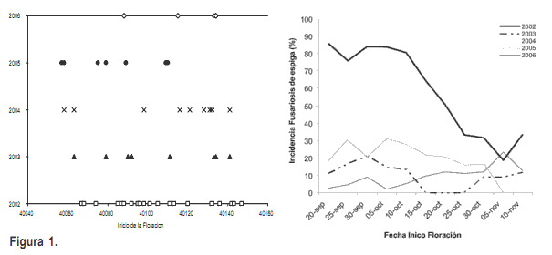 Durante los años en los cuales se realizaron los experimentos (2003-2006), no existieron condiciones favorables para la ocurrencia de epifitias severas de la fusariosis de la espiga, en especial durante octubre, mes en que se concentra la floración del cultivo de trigo a nivel productivo. Utilizando el modelo de Moschini y Fortugno (1996) para estimar la incidencia de la fusariosis de la espiga para cada año de trabajo, se puede establecer que no hubo condiciones predisponentes comparables al año 2002, el que se puede tomar como referencia por sus condiciones favorables para la ocurrencia de epifítias severas (Figura 1).