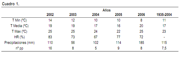 El 2002 presentó los mayores registros en número de lluvias, asociadas a una mayor humedad relativa promedio (HR) y temperatura mínima media mayor en relación a los años en estudio (Cuadro 1). La temperatura media y la temperatura media máxima del mes de octubre fue similar en el 2002 a la observada en años en que no ocurrieron epifitias como el período 2003-2006. A su vez el volumen de precipitaciones registrados en el 2005 y 2006 fueron mayores a los registrados en el 2002, lo que sugiere que el volumen de precipitaciones es un mal indicador de las condiciones predisponentes para la enfermedad.