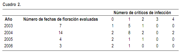 La ocurrencia de períodos críticos de infección fue esporádica para la mayoría de los años (Figura 2). Si se considera que el período en el que ocurrió la floración de los distintos experimentos de cada año fue entre el 6 de septiembre y el 23 de noviembre, el año con mayor número de períodos críticos coincidentes con cultivos en floración fue el 2004 con nueve, sin embargo más de un cultivar se encontraba en floración durante dichos periodos, lo que resultó en 12 situaciones potenciales de infección. El año con menor número de períodos críticos fue el 2006 con sólo cuatro, aunque solo uno de dichos periodos, coincidió con cultivos en floración. En el año 2002 ocurrieron severas epifitias de fusariosis de la espiga que coincide con la frecuencia de ocurrencia de períodos críticos detallado en la Figura 2. Esto indica que entre el 2003 y el 2006 las condiciones predisponentes para la enfermedad fueron limitadas. Si se considera que cada cultivo tiene un período de floración de no más de 15 días (Mazzilli, 2006), se puede concluir que los experimentos estuvieron expuestos a un relativamente escaso número de eventos de infección comparado con años con epifitias severas (Cuadro 2).