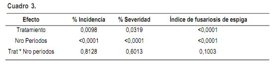 El análisis individual de cada experimento muestra que en la mayoría, los niveles de enfermedad observados (índice de fusariosis de la espiga) no difirieron estadísticamente entre el tratamiento Testigo (T0) y el Tratado (T1) en 48 de 50 experimentos. Este resultado fue independiente del número de períodos con condiciones predisponentes ocurridos en cada experimento (datos no presentados). Sin embargo, en el análisis conjunto de los 50 experimentos, se detectaron diferencias significativas (P<0.05) entre los tratamientos T0 (sin fungicida) y T1 (fungicida a inicios de floración), y entre el número de períodos críticos al que fue expuesto el cultivo, para las tres variables analizadas (porcentaje de incidencia, porcentaje de severidad e índice de fusariosis de la espiga).