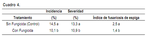 Otro aspecto a resaltar es la baja eficiencia de control que presentó el fungicida aplicado a inicios de floración (30%, 18% y 44% de eficiencia para incidencia, severidad e índice de infección, respectivamente), aún cuando el fungicida fue aplicado en óptimas condiciones (400 l ha-1, pastillas de doble abanico plano y controladas las condiciones de viento y % HR) y con uno de los principios activos de mejor control disponible en el mercado (Díaz et al., 2002; Pereyra y Stewart, 2002). Un resumen de información sobre control de fusariosis de la espiga generada a nivel local, en ensayos llevados a cabo entre 1991 y 2002, concluye que para las aplicaciones de tebuconazol la eficiencia promedio para el porcentaje de incidencia fue de 44%, variando entre 38 y 52%, mientras que para metconazol la eficiencia fue de 51%, con variaciones entre 21 y 65% (Díaz, 2004). Por lo tanto los bajos niveles de eficiencia de control encontrados en el presente estudio, se ubican dentro del rango observado en otros estudios locales, y probablemente están fuertemente influenciados por los bajos niveles de enfermedad observados en el testigo (T0).
