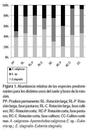 A diferencia de los Ocnerodrilidae, A. caliginosa mostró preferencia por los usos del suelo con presencia de leguminosas forrajeras. Estos ambientes, comparados con los de agricultura continua, tienen una frecuencia menor de uso de herbicidas, una cantidad baja o nula de rastrojo en superficie, la densidad aparente es menor y el contenido de carbono del suelo es mayor. Esto último es sinónimo de una disponibilidad mayor de sustratos (Riley et al., 2008; Eriksen-Hamel et al., 2009). Las pasturas producen más materia orgánica, a través de la descomposición de raíces y de material superficial que deja sin consumir el ganado, así como por los exudados radiculares. Momo et al. (2003) encontraron que el género Aporrectodea tiene preferencia por ambientes perturbados, con suelos de buena estructura y contenido alto de materia orgánica. En las rotaciones, la presencia de pasturas por un período de tiempo más prolongado determinó que en la fase cultivos, la densidad poblacional de A. caliginosa permaneciera constante.