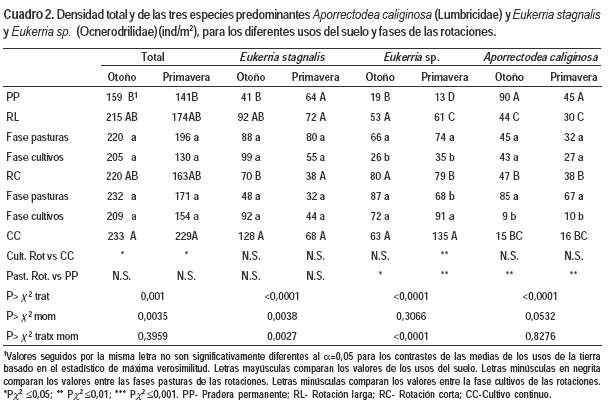 En relación a las diferencias encontradas en la composición específica de las comunidades, las mismas son similares a las registradas en los muestreos realizados en el año 2003 (Zerbino et al., 2006; Zerbino, 2007), con la diferencia que en ese año A. caliginosa no fue colectada en CC. También se destaca que en los muestreos de 2007 las densidades totales registradas en todos los usos del suelo fueron superiores respecto al 2003. La densidad total promedio de los dos muestreos en ambos años, 2003 y 2007 respectivamente, fueron en CC de 187 ind/m2 y de 231 ind/m2, en RC 135 ind/m2 y 191 ind/m2, en RL 104 ind/m2 y 194 ind/m2 y en MP estos valores fueron de 132 ind/m2 y 150 ind/m2. Si bien estos resultados pueden ser debidos a las condiciones climáticas registradas, también hay que considerar que los años en siembra directa aumentaron.