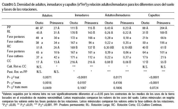 En todos los usos del suelo y fases de las rotaciones predominaron los inmaduros sobre los adultos (Cuadro 3). En la densidad de los adultos, hubo interacción entre tratamiento y momento de muestreo. Se registraron diferencias significativas en primavera entre la fase pasturas de ambas rotaciones, la cantidad de adultos de RL fue mayor que en RC, y en el contraste entre el promedio de la fase cultivos y CC (37 vs 17 ind/m2). Para la densidad de inmaduros se detectaron efectos de tratamiento y momento de muestreo. A CC correspondió el mayor valor, los restantes usos del suelo fueron similares entre sí. El promedio de inmaduros de la fase pasturas de las rotaciones fue mayor que el de PP (167 vs 114 ind/m2) y por el contrario el de la fase cultivos fue menor que el de CC (137 vs 216 ind/m2). Estos resultados determinaron que la relación adultos/inmaduros fuera más baja en CC que en PP. Para los capullos hubo efecto del tratamiento y del momento de muestreo.