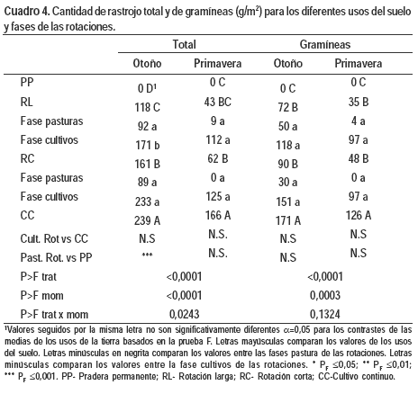 Los resultados del análisis de varianza determinaron efectos de los tratamientos para el rastrojo total y de las gramíneas (Cuadro 4). En el primer caso se registró interacción entre tratamiento y momento de muestreo, sin embargo en los dos momentos el mayor y menor valor correspondieron a CC y PP respectivamente. En otoño, la cantidad de rastrojo total presente en la fase cultivos de RC fue mayor que en RL. El promedio de la fase pasturas de las rotaciones fue superior al valor de PP.