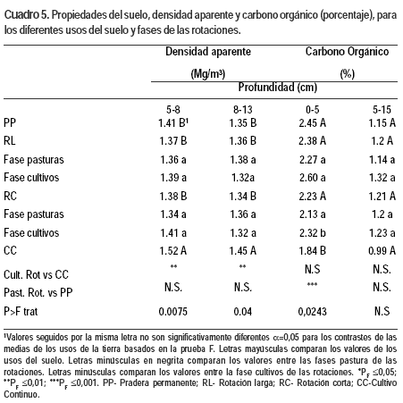 Hubo efecto de los tratamientos para la densidad aparente en las dos profundidades estudiadas y el porcentaje de carbono orgánico en la porción de suelo más superficial (0-5 cm). En CC se registraron el mayor y el menor valor, respectivamente, para la densidad aparente y el porcentaje de carbono orgánico. Para estas variables los restantes usos del suelo fueron similares entre sí. Sólo hubo diferencias en la fase cultivos de las rotaciones para el porcentaje de carbono orgánico en superficie (0-5 cm), el cual fue mayor en RL respecto a RC (Cuadro 5).