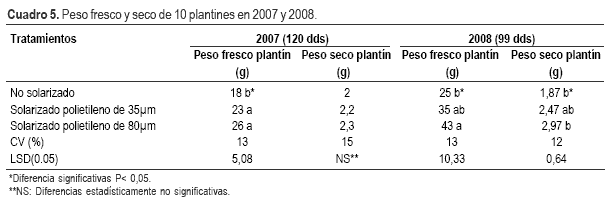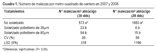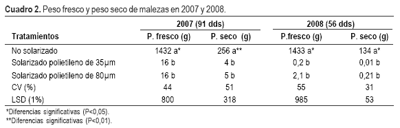 Los tratamientos solarizados tanto con polietileno de 35 µm como de 80 µm no tuvieron diferencias estadísticamente significativas entre sí ni en el peso fresco ni en el peso seco de malezas presentes por metro cuadrado de cantero en 2007 y en 2008 (Cuadro 2). Ambos fueron estadísticamente diferentes al testigo sin solarizar.