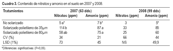 El análisis del contenido de nitrato y amonio en el suelo de las parcelas indicó que los tratamientos solarizados tuvieron significativamente mayor contenido de nitratos y de amonio que los no solarizados (Cuadro3). Esto concuerda con lo reportado por Chen et al. (1991), quienes afirman que suelos con mulch de plástico y suelos esterilizados con vapor de agua generalmente tienen mayores niveles de nutrientes solubles que los que no han sido tratados. Por su parte Besri (1991) encontró que en los suelos solarizados para controlar enfermedades fúngicas en tomate, el contenido de nutrientes era mayor.