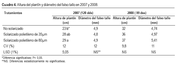 No se encontraron diferencias estadísticamente significativas en el diámetro del falso tallo entre los tratamientos (Cuadro 4).