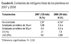 El peso fresco de los plantines provenientes de las parcelas solarizadas tanto con polietileno de 35 como de 80 µg presentó los mayores valores y fue estadísticamente diferente del tratamiento testigo (Cuadro 5). El peso seco fue mayor en los tratamientos solarizados en comparación con el testigo en 2008. Los plantines provenientes de los tratamientos con solarización presentaron un contenido de N foliar mayor que los del tratamiento sin solarizar (Cuadro 6) y esa diferencia fue estadísticamente significativa en 2008. Estos resultados pueden explicarse por el mayor contenido de nitratos y de amonio encontrado en los tratamientos solarizados en relación al no solarizado.