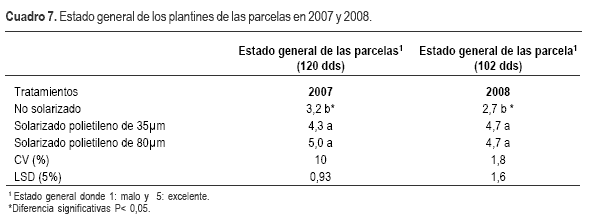 Los plantines provenientes de los canteros que habían sido solarizados presentaron un estado general significativamente más desarrollado al de los plantines del tratamiento no solarizado en ambos años, (Cuadro 7).
