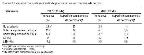 El porcentaje de punta seca de la primera hoja de esos mismos plantines fue estadísticamente superior en el tratamiento no solarizado en relación al solarizado en 2007 (Cuadro 8).