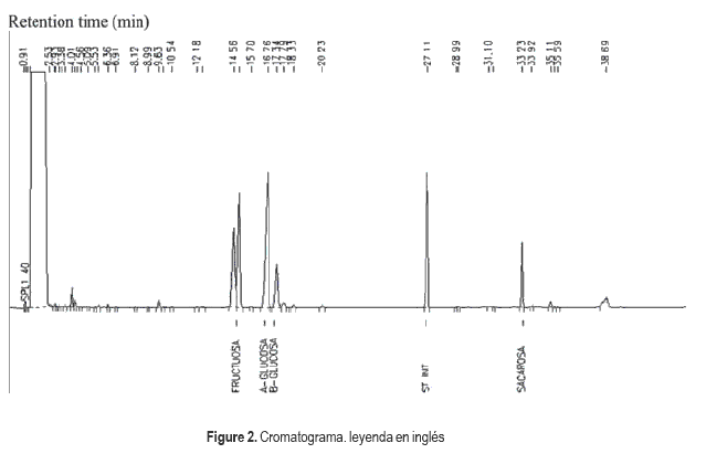 Measurement of the oxime-TMS sugar was carried out with a Perkin Elmer Auto System XL chromatograph with Flame Ionization Detector (FID) and equipped with an J & W, Scientific, Folsom, Ca, USA capillary column (30 m long x 0.32 mm (ID), 0.25 µm film thickness). The injector was kept at 250 ºC and operated in split less mode. The injection volume was 1.0 µL. Nitrogen was employed as a carrier gas at a constant flow rate of 1.7 ml min-1.