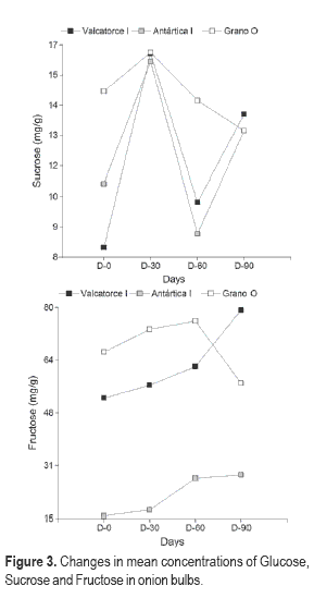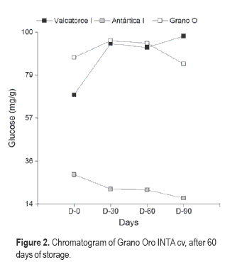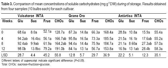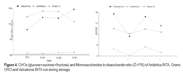 The ratio of monosaccharide to disaccharide varied from harvest to 12 weeks of storage between 4.7-3.5 cultivar Antartica INTA, 12.1-10.9 Grano Oro and Valcatorce INTA 17.5-13.2. Towards the end of storage, this ratio showed a tendency to increase; better explained by the observed decrease in sucrose than because of glucose increase.