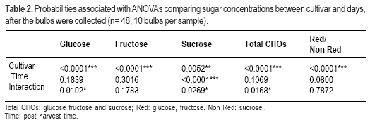 Evidences of differences in the mean sugar content between cultivars were detected. Only sucrose showed highly significant differences (P<0.0001) to several dates post harvest. There was evidence of interaction between glucose, sucrose and total carbohydrate concentrations and evaluation time.