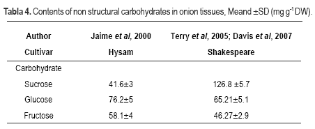 Benkeblia and Shiomi (2004) and Benkeblia et al. (2005a) have reported for cold treated bulbs (kept at 0 °C in the dark during four weeks and then transferred in dark to 20 ºC), soluble sugars increased from 15 to 19 mg g-1 FW (time of sprouting). Afterwards, soluble sugars decreased to 5-7 mg g-1. After four weeks for Grano Oro, and eight weeks for Valcatorce INTA and Antartica INTA, we observed these peaks in experimental environmental condition of storage (Table 1). This variability shows the breakage of bulb dormancy (Table 3), confirmed by interaction cultivar and storage time (Table 2) (Coolong et al., 2008).