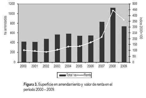 La Figura 3 muestra como la renta de la tierra se ha más que triplicado en el término de 10 años. Las altas rentas que se pagan generan la figura del «rentista», o sea la del propietario de la tierra, que prefieren arrendarla a empresas que le generan renta que difícilmente y sin riesgo obtienen explotándola ellos.
