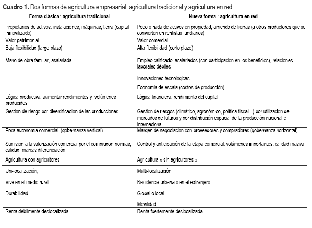 El Cuadro 1 resume las principales diferencias entre esta nueva forma de empresa y el agronegocio clásico que aun coexiste.