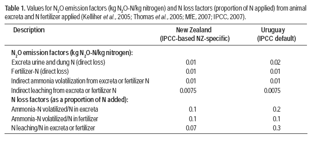 For nitrous oxide (N2O) determination, animal DMI was combined with dietary N concentration data to estimate N intake, and N output in meat was subtracted to calculate excreta-N deposition. The amount of N excreted was then combined with NZ specific direct and indirect (from N leaching and ammonia volatilization) N2O emission factors (Table 1) to calculate N2O emissions. The same tier 2 approach was used to calculate emissions from N fertilizer. It is important to take into account that, while the model assumes a pasture nitrogen (N) concentration of 3% (based on NZ average data), this is higher than the average for natural grassland from Uruguay. This could therefore exaggerate the N2O emissions calculated for Uruguayan conditions because cows on feed with a lower concentration of N or crude protein result in less excreta-N and proportionately less urinary N (Misselbrook et al., 2005) and hence lower N2O emissions. Thus, analyses for the Uruguayan farm systems used an average of 2.5%N (Formoso and Colucci, 1999).