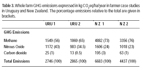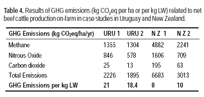These results clearly show that differences in methodology can have a large effect on calculated GHG emissions. The much lower emissions per kg DMI from NZ-specific data highlight the benefit in obtaining specific national data from Uruguay to estimate GHG emissions per hectare and per functional unit.