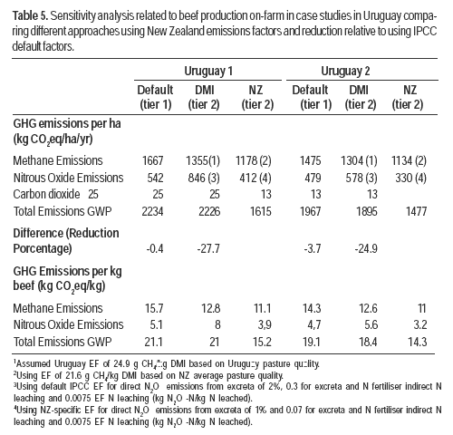 Considering the similarities in production conditions and pastoral resource uses in both countries, it is useful to conduct a sensitivity analysis of the effect of using common emissions factors (Table 5). By conducting a sensitivity analysis using the default IPCC and NZ emissions factors, it is possible to estimate how using researched emissions factors, consistent with the Uruguayan reality, might alter total GHG emission figures.