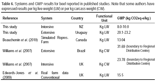 Estimated emissions of greenhouse gases, taking into account the extensive systems in Uruguay (18.4-21 kg CO2eq/kg LW), were broadly similar to studies by Williams et al. (2007) (31.7 kg CO2eq/kg CW ~ 16 kg CO2eq/kg LW) for Brazil of the systems using native grasses. However, different methodologies were used (including the functional unit and system boundary), and there will be some production differences due to lower stocking rates, lower efficiency and productivity per hectare.