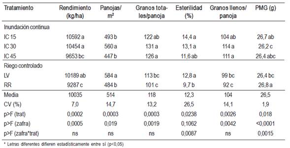 Los componentes de rendimiento asociados a los niveles de productividad descriptos anteriormente, si bien tuvieron diferencias significativas asociadas a los manejos de riego, no tuvieron una relación clara y estable a lo largo de las zafras (interacción año x tratamiento significativa) que puedan explicar las diferencias productivas encontradas. Se evidencia de esta manera que ha existido una compensación entre los valores de los diferentes componentes de rendimiento en la expresión del mismo y que esta compensación ha cambiado en las diferentes zafras. De todas formas el manejo de riego RR, el cual presentó los menores rendimientos, estuvo asociado al menor número de panojas m-2, granos totales y granos llenos por panoja, reflejando un menor número de granos m-2 que no pudo ser compensado por el peso de mil granos.